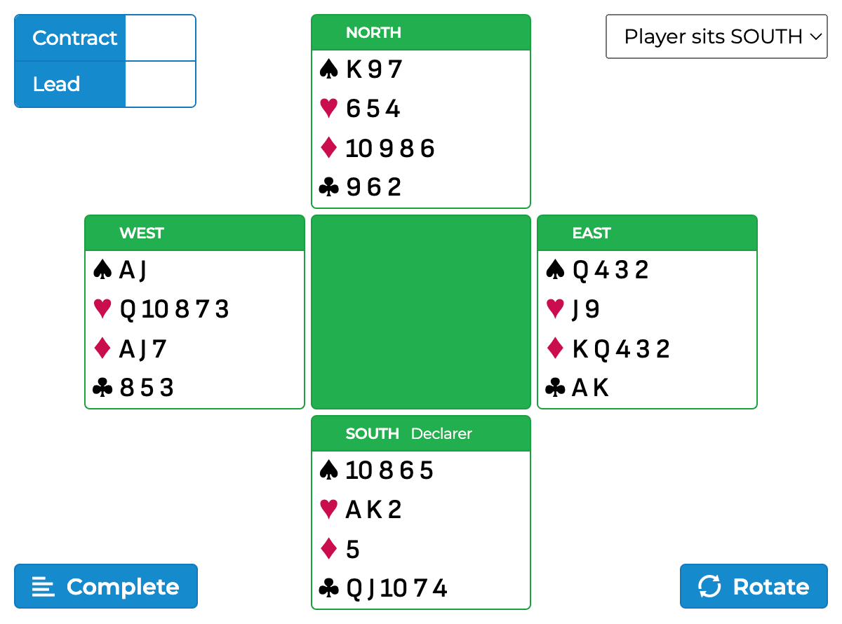 Εμφανίζεται το διάγραμμα της επιλεγμένης διανομής. Μπορείτε επίσης να πληκτρολογήσετε τα φύλλα. Ο εκτελεστής, είτε είναι μαθητής είτε ένα ρομπότ, θα κάθεται πάντα Νότος, με τον μορ στον Βορρά.