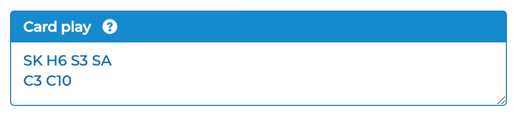 Κάθε λεβέ (ολοκληρωμένη ή μη) δίνεται σε μία γραμμή. Τα φύλλα ορίζονται από το σύμβολο του χρώματος (S για s, H για 3, D για 4 and C για c) ακολουθούμενο από την αξία τους (A, K, Q, J, 10… 2).