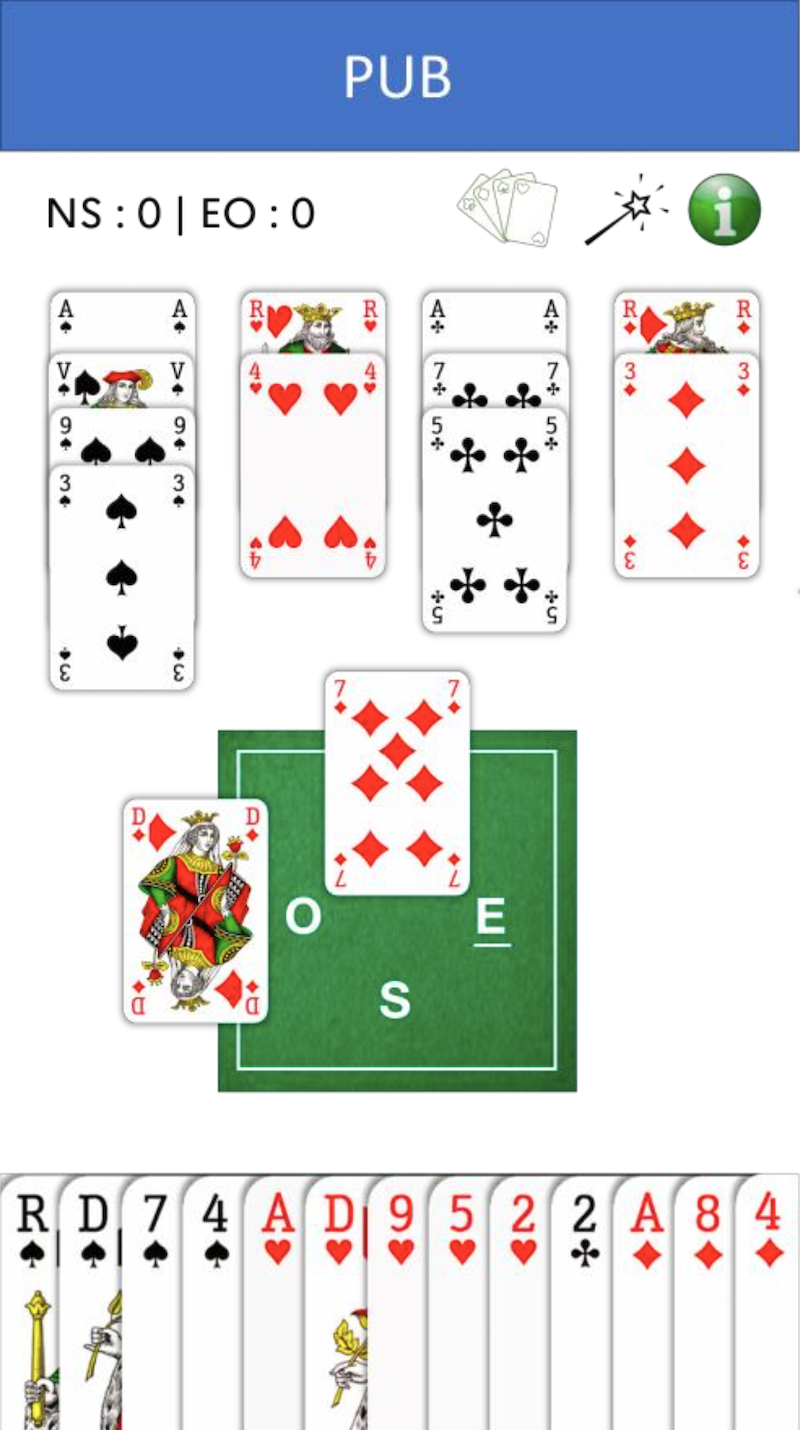 1η λεβέ: αντάμ ο Ρήγας Πίκα, το 6 Κούπα από τον μορ, το 3 Πίκα από την Ανατολή, ο Άσος Πίκα από τον Νότο